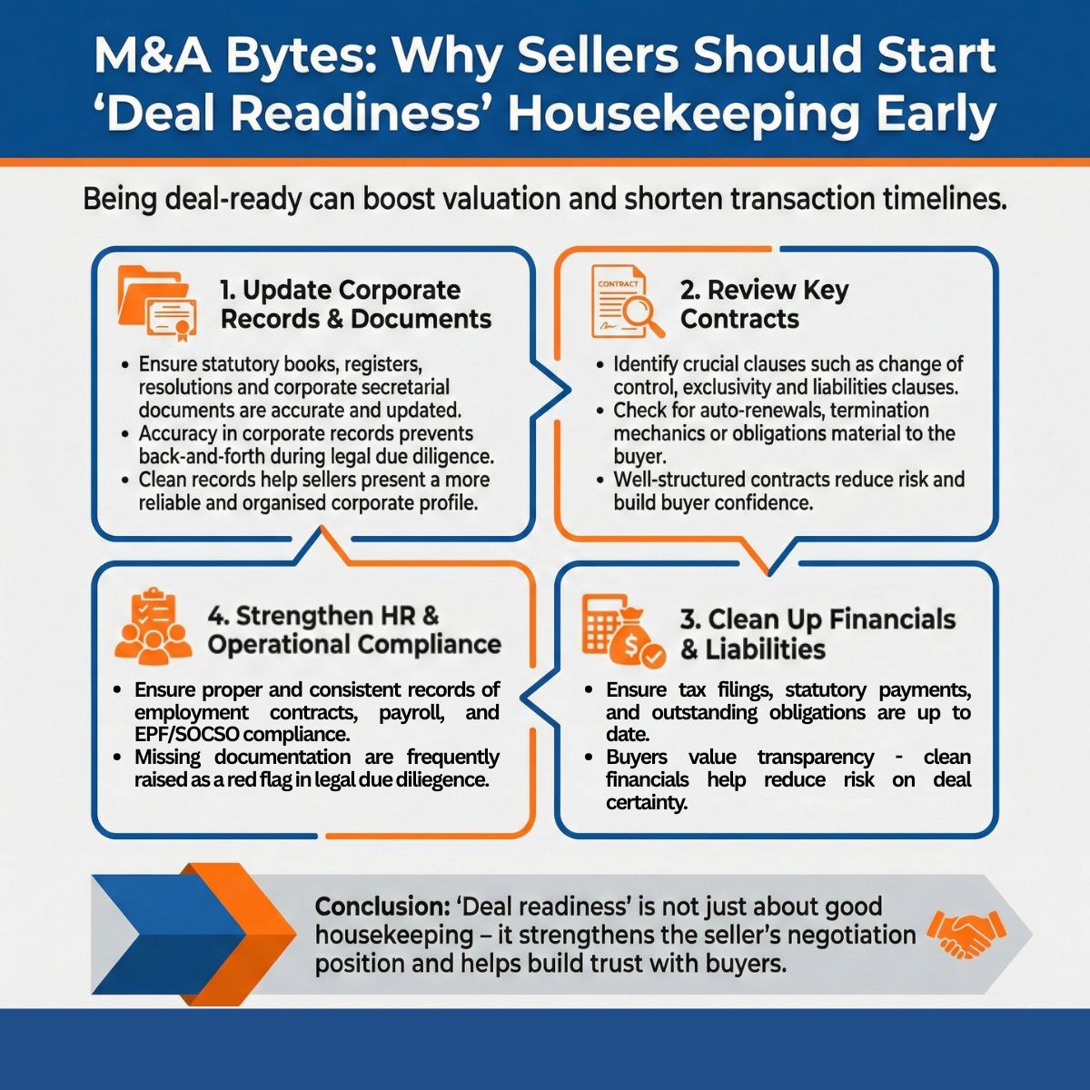 “Deal readiness” is not just about good housekeeping – it strengthens the seller’s negotiation position and helps build trust with buyers.